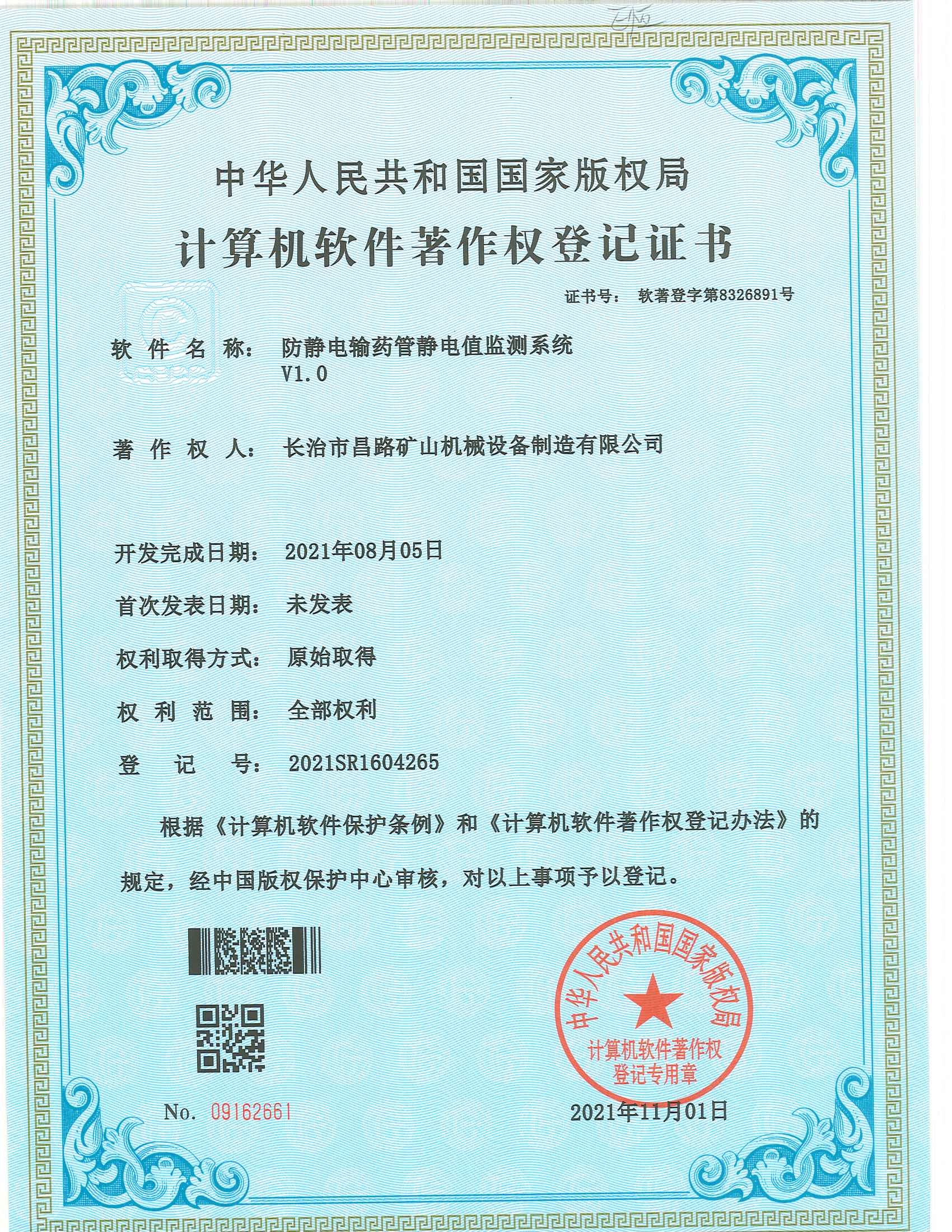 榮獲防靜電輸藥管靜電值監(jiān)測(cè)系統(tǒng)著作權(quán)登記證書